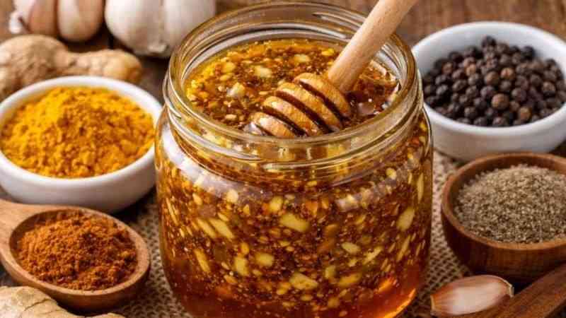Bu 5 ədviyyatı 1 stəkan bala tökün və qarışdırın. Təxminən bir saat saxladıqdan sonra səhər və axşam bir qaşıq qəbul edin.